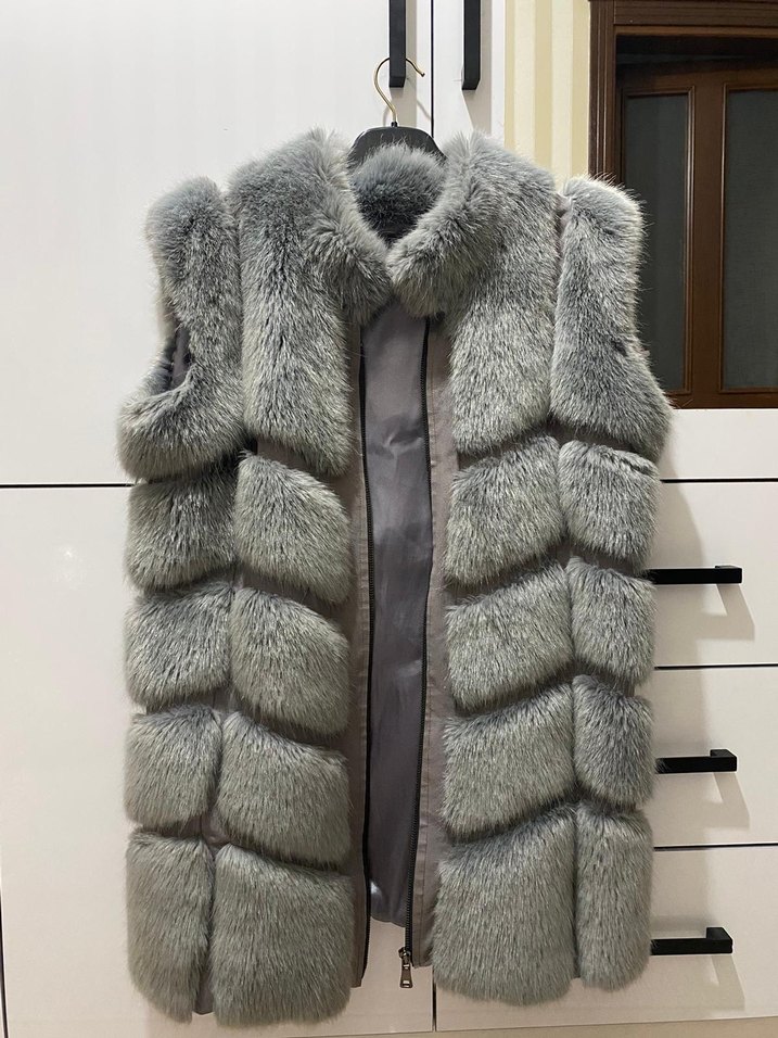 Gri renkte, kürk detaylı, kolsuz, straplez ve normal midi uzunlukta, sokak stiline uygun kadın yelek.