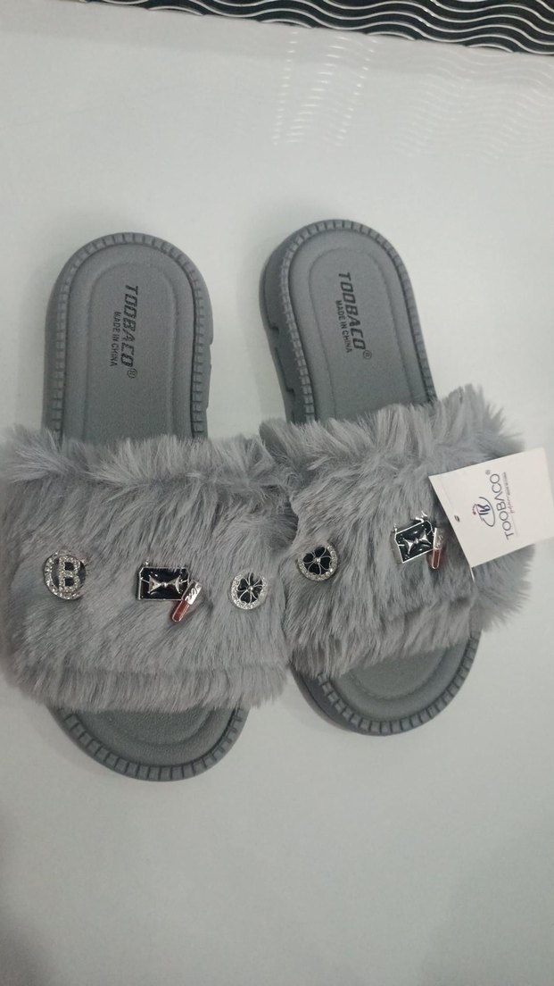 Gri wedge topuklu terlikler, yumuşak kürk detaylı ve nakışlı, rahat sokak stili için uygundur. Marka: TODBACO.