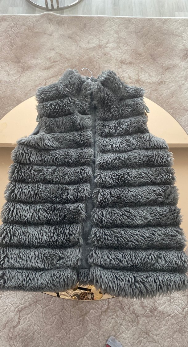 Yüksek yakalı, gri renkli, kürklü detaylı ve kolsuz kadın yelek. Yumuşak kumaştan, fitted kesim ve midi boyda, gündelik kullanıma uygun.