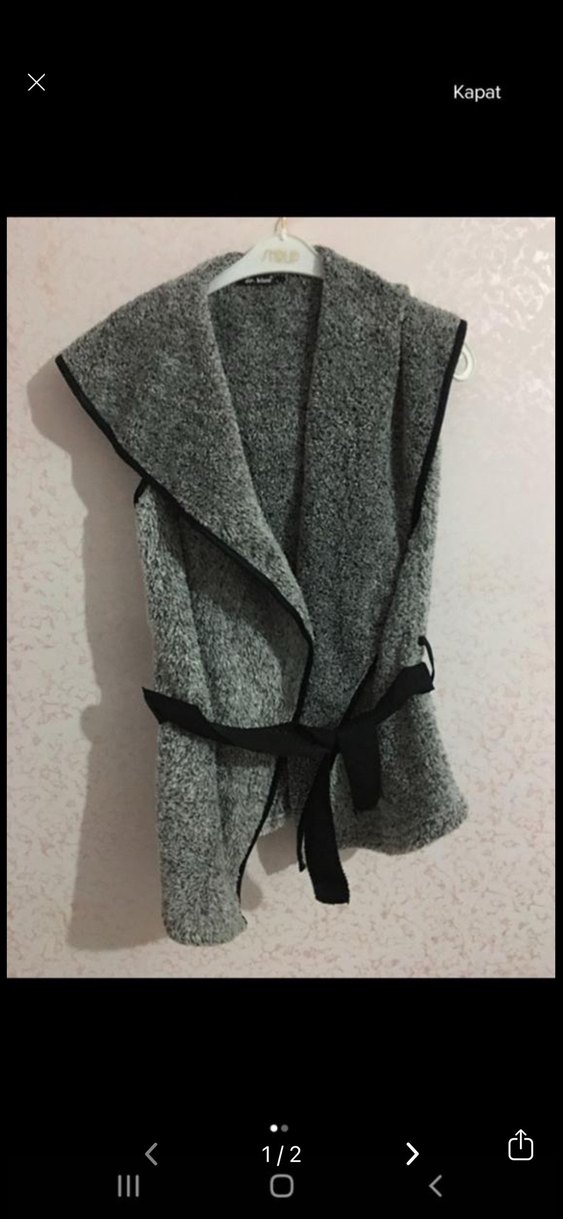 Kürklü detaylı, gri, kolsuz kadın yeleği, yakası kesik ve siyah kemerli, midi boyda, günlük kullanıma uygun şık ve rahat.