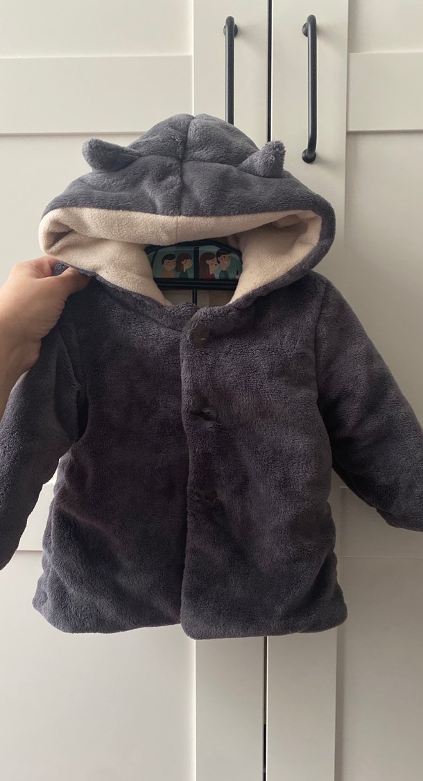 Gri renk, kürklü ayıcık kapüşon ve yakalı, yumuşak ve sıcak kumaştan unisex çocuk kabanı. Streetwear tarzına uygun Birkaç yerinde ufak lekeler var onun dışında temiz ürün birkaç kez kullanıldı.