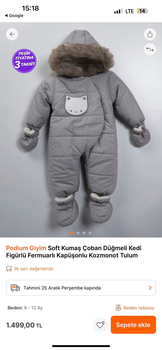 Gri renkte, kürklü kapüşonlu ve eldivenli bebek kozmonot tulumu. Nakışlı kedi figürü ve fermuarlı kapanışlı, yumuşak kumaştan yapılmıştır. Kusursuz. -10 soğukta bununla gezdik üşümedik.