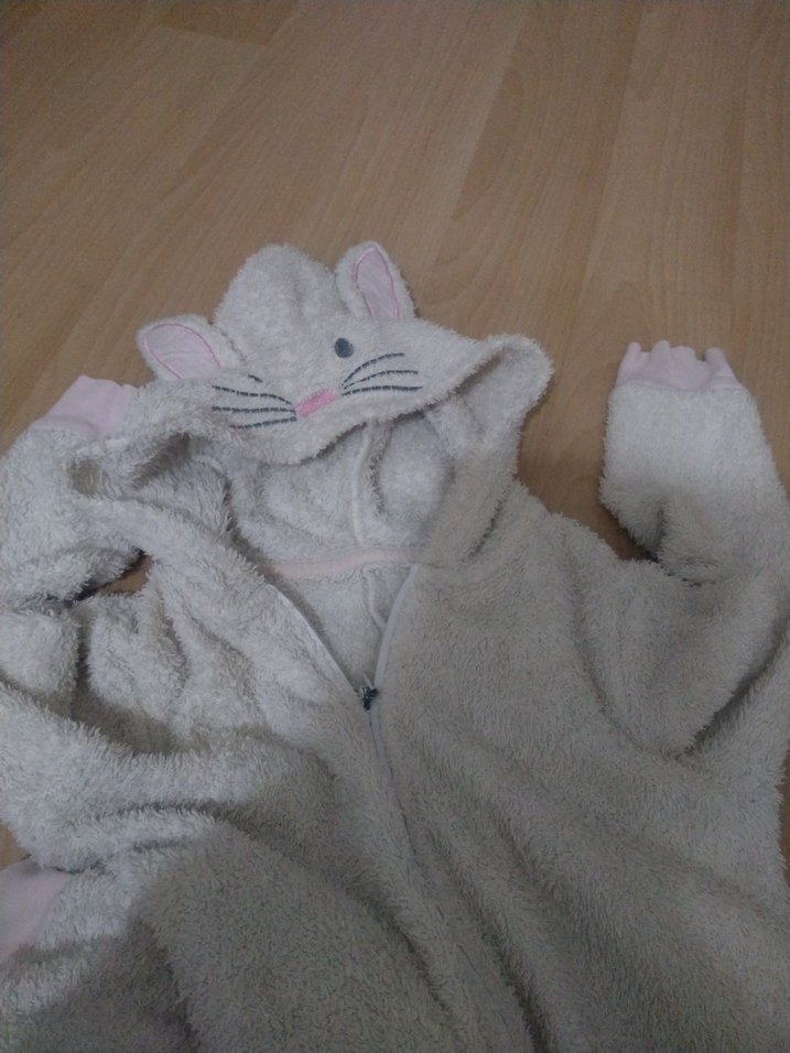 Yumuşak kürklü gri kedi kostümü, kulak ve bıyık detaylı kapüşonlu. Fermuarlı ve pembe pati detaylıdır.