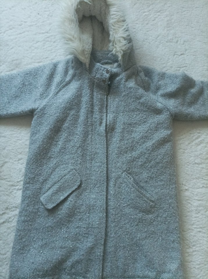 Gri renk, bol kesim kız çocuk kabanı, yakasında kürk detaylı ve çıtçıtlı kapamalı. İki ön cepli, sade ve desensiz tasarım.