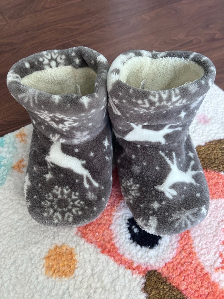 Kız çocukları için gri renkte, kürklü iç yüzeye sahip, yumuşak kumaştan sıcak ev terliği. Geyik ve kar tanesi desenleriyle rahat ve konforlu.