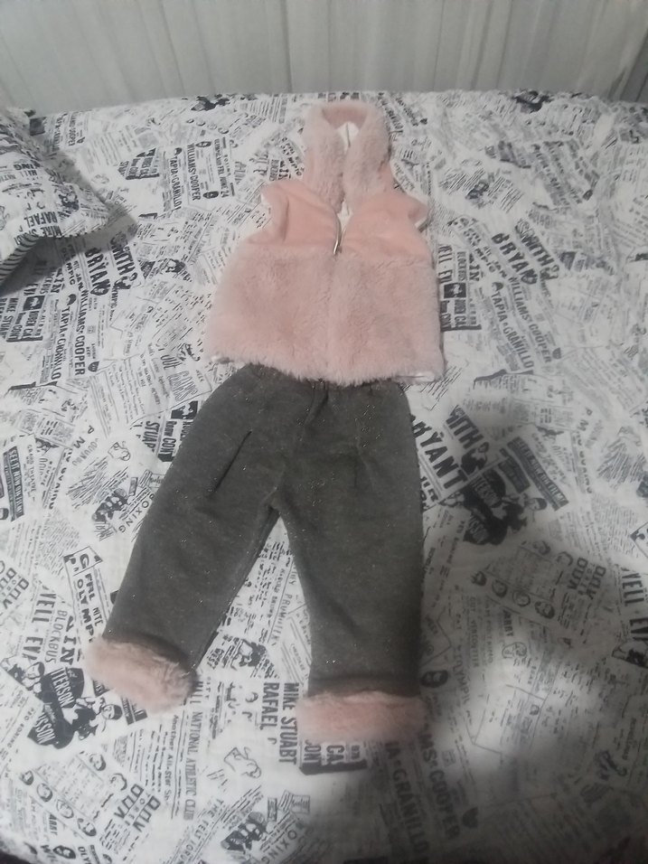 Kolsuz, yumuşak pembe kürklü üst ve gri alt kısmı kürklü bebek kız takımı. Rahat ve sıcak tutar. sayılı giyilmiştir yelek pantolon