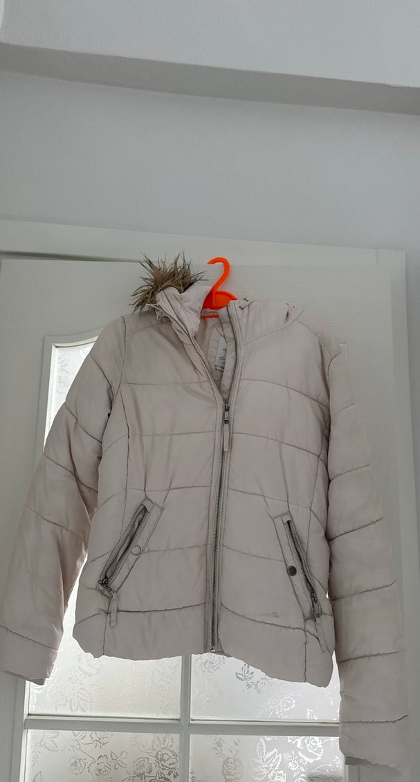 Gri kürklü, yakalı ve normal boyda, fitted kesim kadın kışlık mont. Yumuşak ve sıcak kumaştan, dış mekan için uygun.
