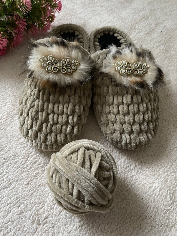 Gri örme yapıya sahip, kürk detaylı ve nakışlı bohem tarzda kadın ev terliği. Yüksek topuklu tasarımıyla dikkat çeker.