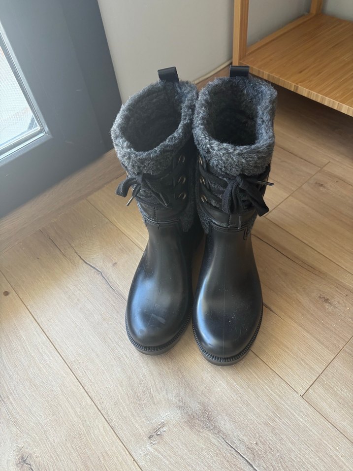 Siyah kauçuk yağmur çizmesi, gri yumuşak kürk astar ve tokalı kayışlara sahiptir. Blok topuklu, günlük rahat ve gotik tarz için uygundur. ️yargıcı markası 38 numara. 1 defa giyildi yalnızca.