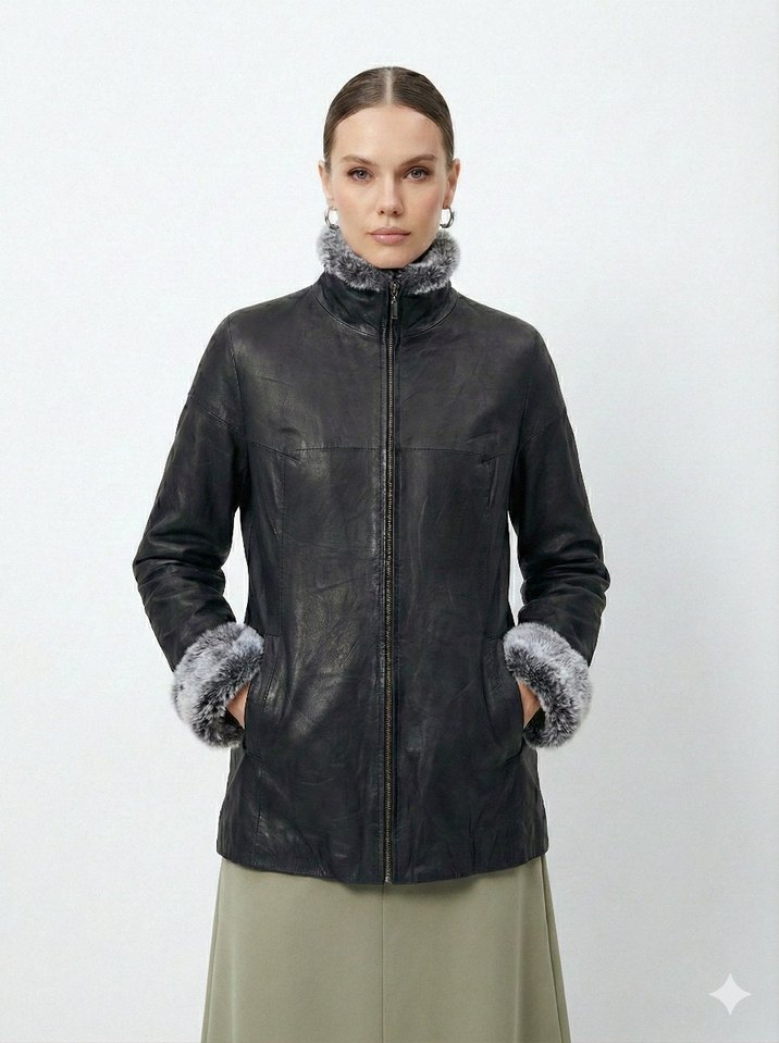 Gri Kürklü Siyah Deri Kadın Ceket