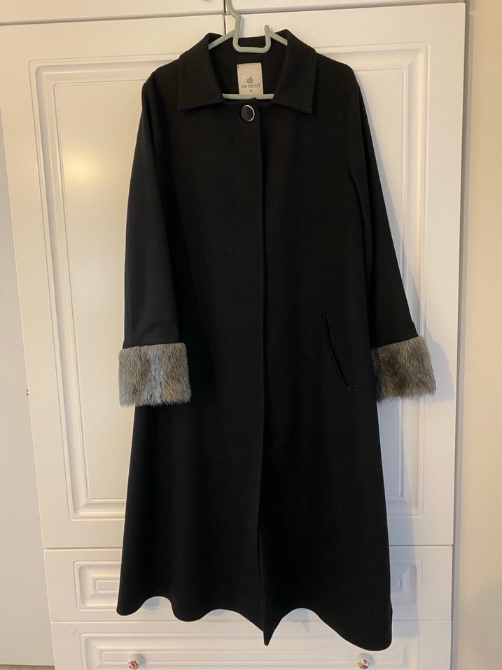 Siyah kaban, gri yumuşak kürk manşetlere ve klasik yakaya sahiptir. Düğmeli kapanış ve yan cepler bulunur. Keçe kumaştır . İçi astarlıdır.