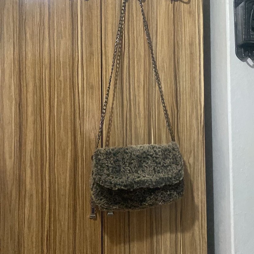 Gri renkli, triko malzemeden yapılmış, kürk detaylı, bohem tarzda, zincir askılı, bağlama desenli kadın çantasıdır.