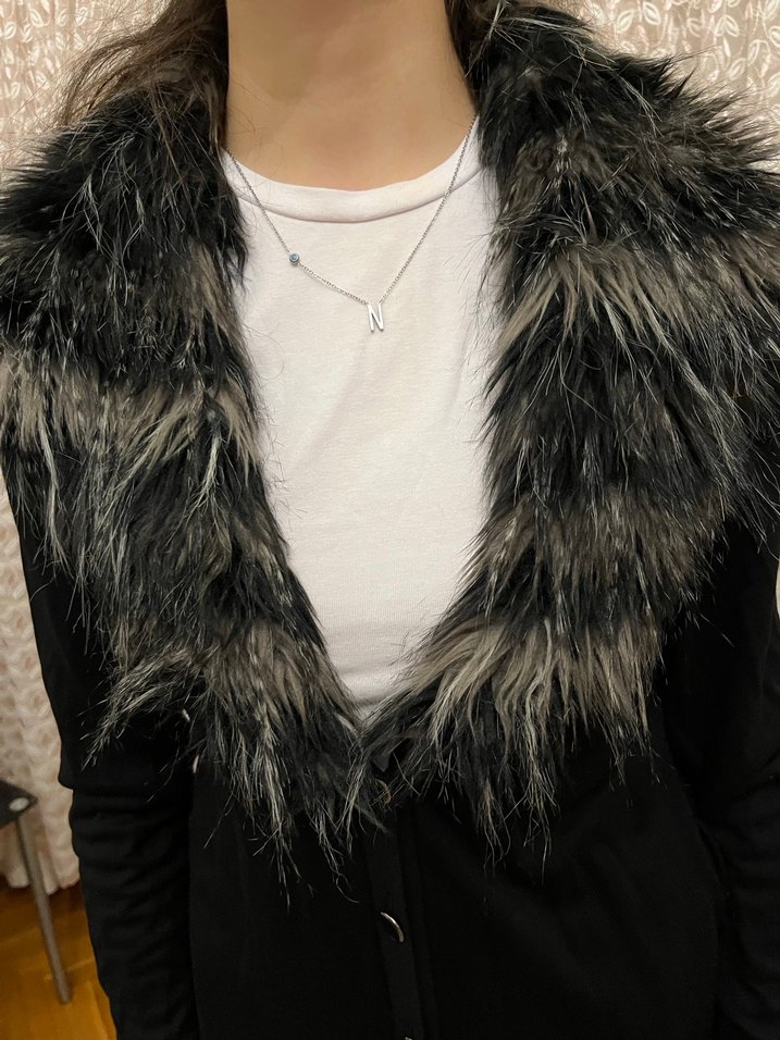 Gri renkte, kürklü yakalı ve uzun kollu, peluş kumaştan yapılmış, diz boyu, vücuda oturan kadın ceketi. Rahat ve gotik stil sunar, günlük kullanım için uygundur.