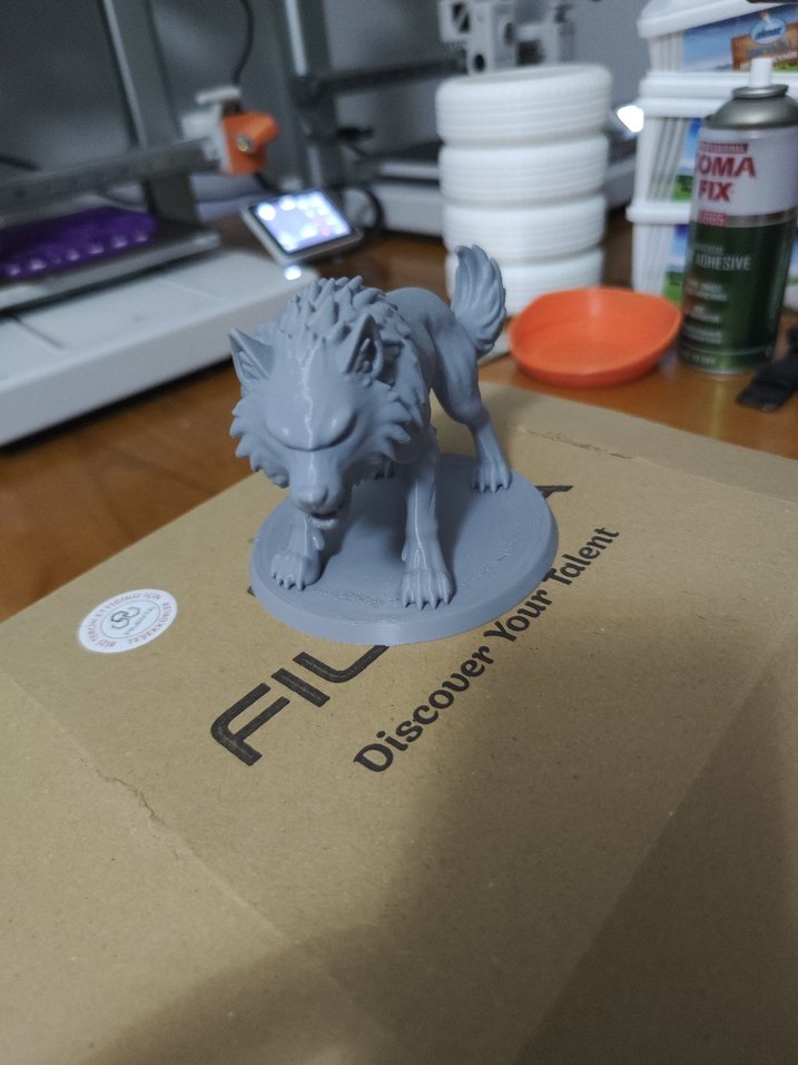 Bu gri kurt figürü, detaylı işçilik ve dinamik poz ile yuvarlak taban üzerinde yer alır. Üzerinde 'MA, IX' işaretleri bulunur.