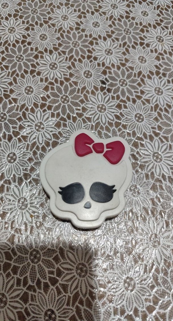 Kırmızı fiyonk detaylı gri kurukafa figürlü gotik broş, parti ve rock punk tarzına uyum sağlar. Dantel arka planla gotik havası güçlenir.