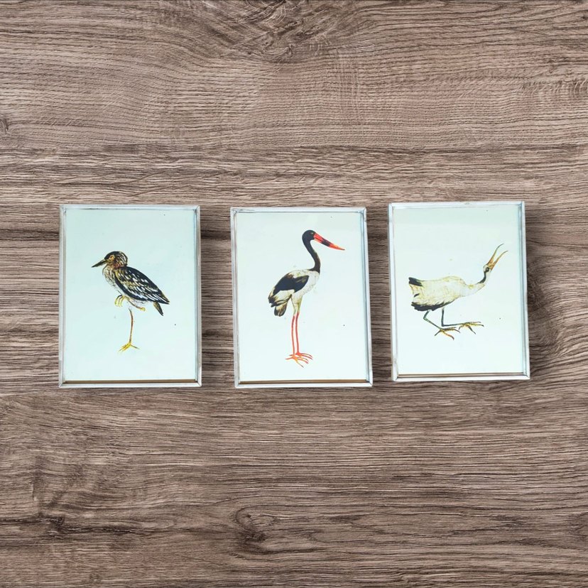 Üç farklı kuş çizimi içeren gri çerçevelerden oluşan set. Her çerçeve sade arka planlı farklı bir kuş tasarımı sunar. ️metal çerçeveli cam