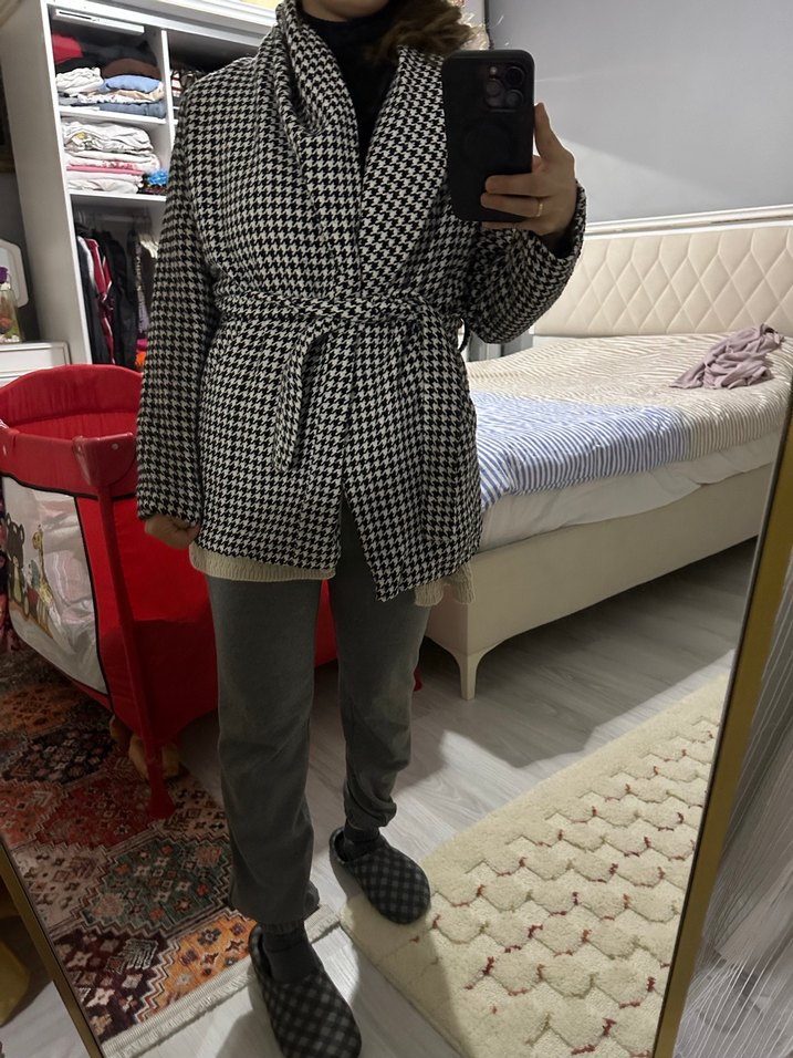 Gri ekose desenli, kuşaklı ve notched yaka detaylı, bol kesim midi ceketi, sentetik kumaştan üretilmiştir.