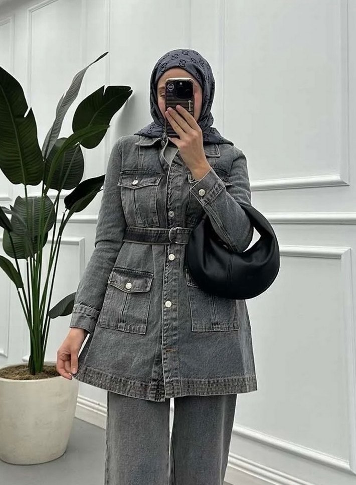 Gri renkte, kuşaklı ve normal boyda kadın denim cekettir. Uzun kollu, yakalı ve batik desenlidir, günlük sokak stiline uygundur.