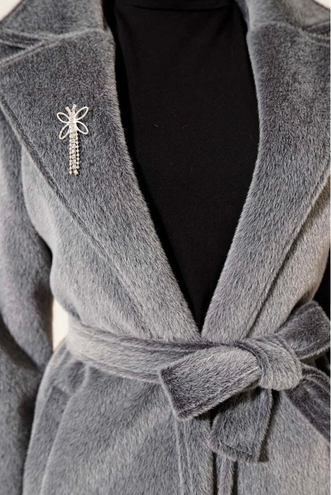 Kadınlar için yumuşak gri kumaştan yapılmış, kuşaklı ve yakasında dekoratif broş bulunan kaban.
