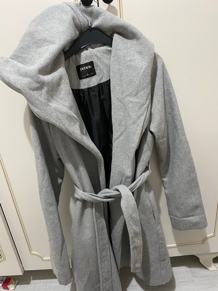 Yumuşak dokulu gri kadın kaban, geniş yakalı ve bel ayarı için kuşaklıdır. İç kısmı rahatlık sağlayan astarlıdır.