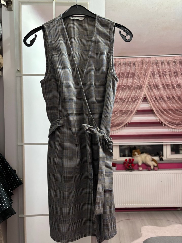 Gri kareli desenli, kuşaklı ve notched lapel yaka detaylı, kolsuz midi uzunlukta kadın yelek. Ofis ve sokak modasına uygun, regular fit. 1 kez giyildi #stradivariuselbise #karelielbise
