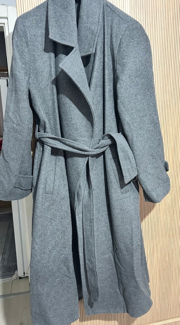 Geniş yakalı, kuşaklı uzun gri kaban. Yumuşak ve sıcak tutan kumaştan üretilmiştir.