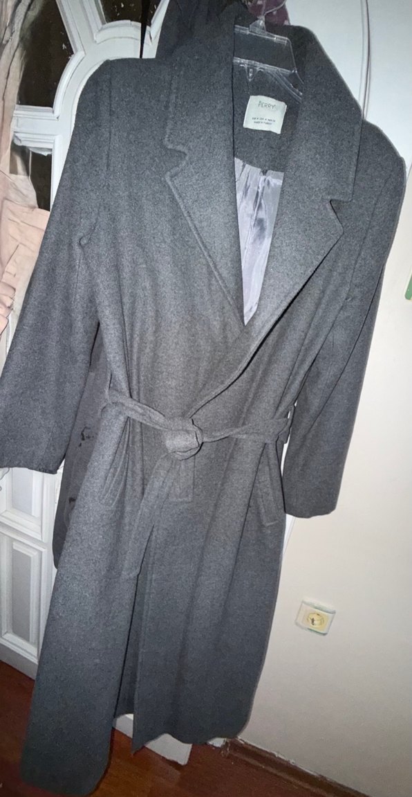 Gri renkte, kuşaklı ve uzun model kaban. İç kısmı astarlı ve klasik yaka detayına sahip.