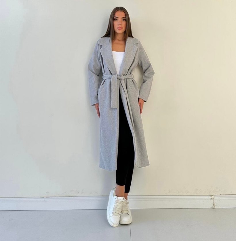 Gri renkte, kuşaklı ve uzun kesime sahip klasik yaka kaban, şık ve sade bir görünüm sunar.