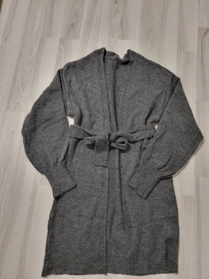 Gri renkte, kuşaklı ve uzun kollu yün hırka. Normal boyda, bol kesim ve yakası kesik detaylı, rahat ve şık bir tercih.