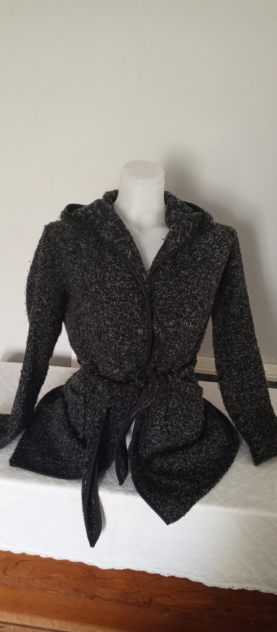 Gri yünşü kaban, kuşaklı bel ve kesikli yaka detaylarına sahiptir. Uzun kollu, midi boy ve regular fit ile günlük kullanıma uygundur.