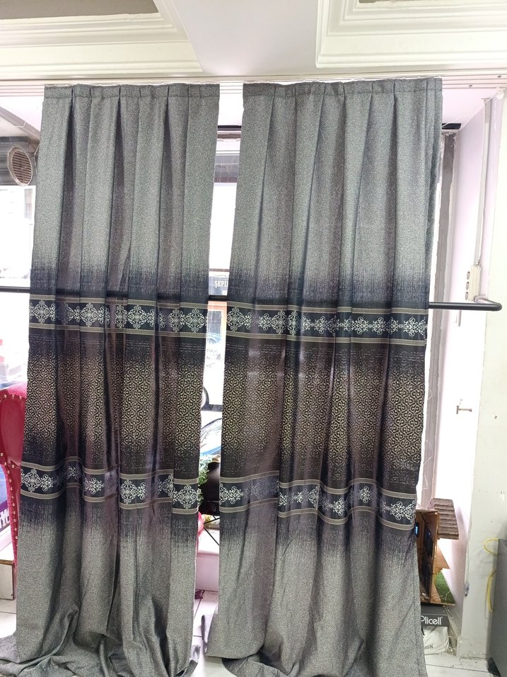 Gri lacivert bağlama deseni ve dekoratif yatay bantlara sahip geleneksel tarzda perde.