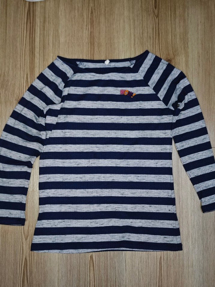 Gri lacivert çizgili, düğmeli ve uzun kollu örme kadın tişörtü, rahat kesimiyle günlük kullanıma uygundur.