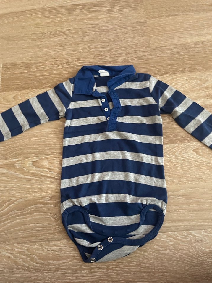 Uzun kollu, yakalı ve düğmeli bebek body. Gri ve lacivert çizgili, yumuşak sentetik kumaştan üretilmiş. Rahat ve sade tasarım.