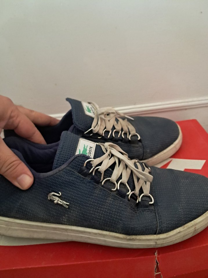 Gri Lacoste erkek spor ayakkabısı, mavi kumaş ve beyaz tabanlı, klasik bağcıklı ve metal halkalı tasarım. Sokak tarzı için uygun.