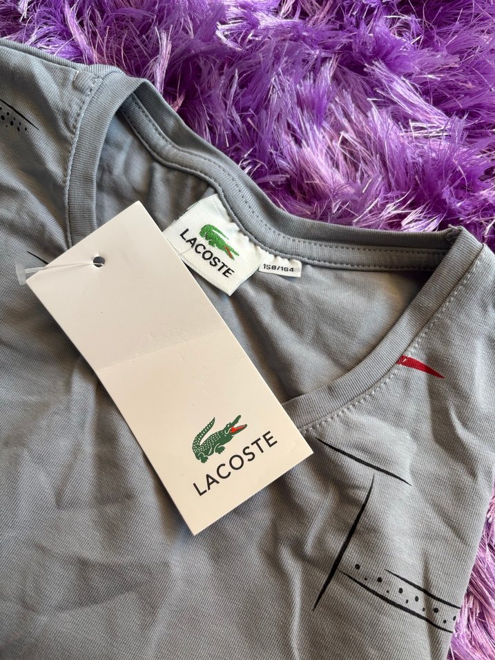 Gri renkte, Lacoste markalı erkek tişörtü. Yumuşak kumaş ve ikonik Lacoste logosu ile rahat ve şık görünüme uygun.
