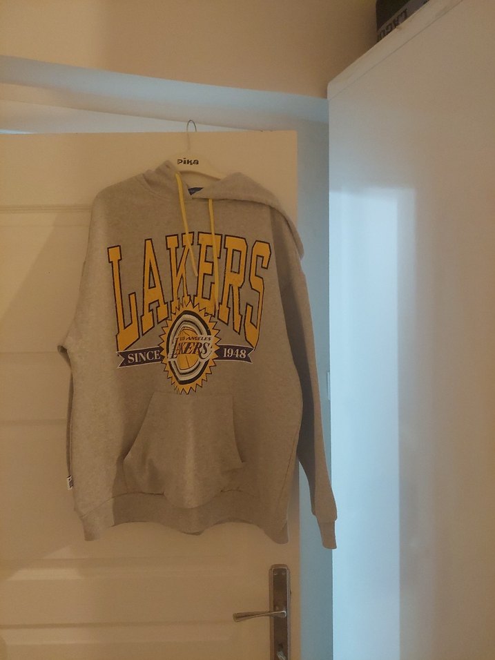 Gri Lakers baskılı, uzun kollu ve bol kesim kapüşonlu sweatshirt. Zincir detaylı, yumuşak ve sıcak kumaştan üretilmiştir.