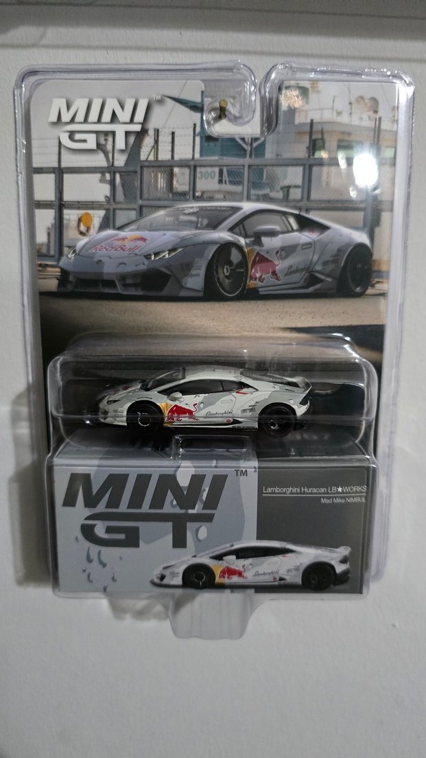 Mini GT tarafından tasarlanmış, detaylı Red Bull yarış grafiklerine sahip gri Lamborghini Huracan oyuncak araba.