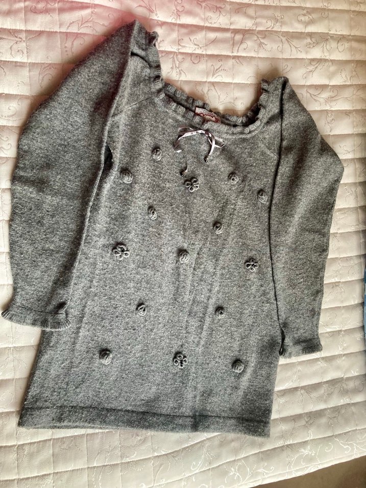Uzun kollu, yuvarlak yakalı gri yün kazak, nakış detaylarıyla süslenmiş. Rahat kesimi günlük kullanıma uygun, rahat bir tasarım.