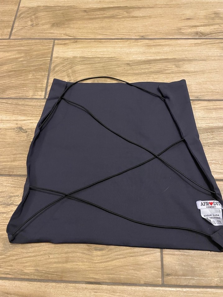 Koyu gri renkte, düz yüzeyli arkasında siyah elastik ipler bulunan spor klasik kombine açık büstiyer. M bedendir.