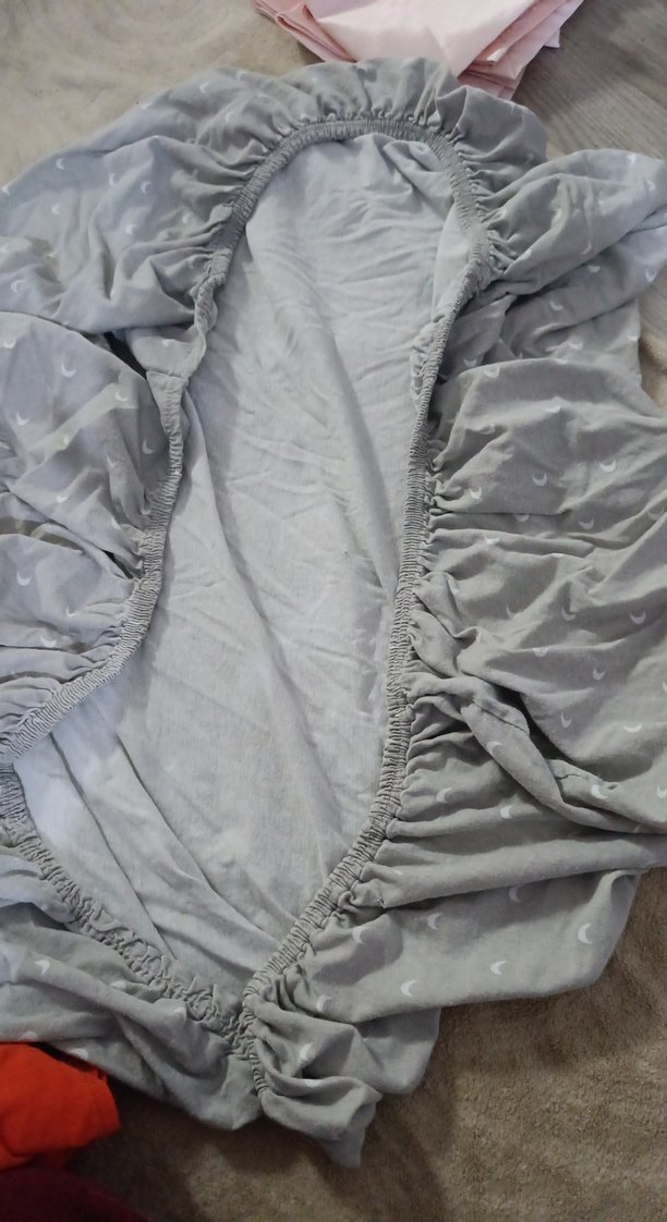Gri lastikli çarşaf, yumuşak kumaş ve ay desenleriyle, elastik kenarı sayesinde yatağa kolayca oturur. Park beşik yatakları için uygundur
