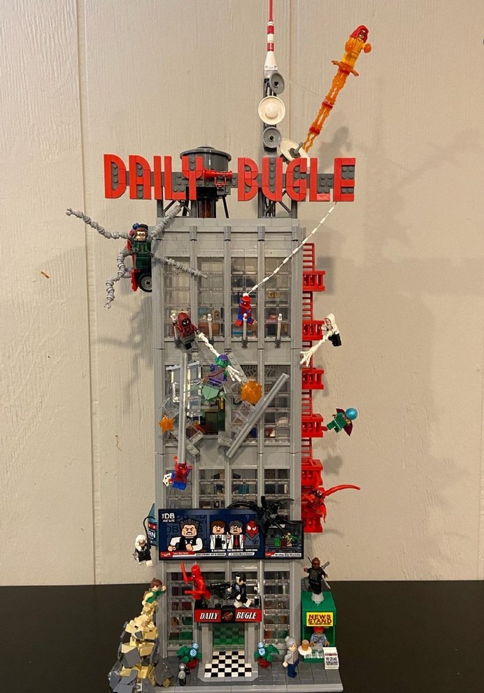 Gri Lego set, Daily Bugle binası ve Spider-Man ile kötü karakterler dahil çok sayıda minifigür içerir. ️