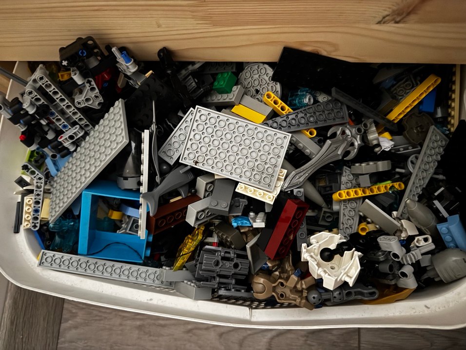 Gri ve renkli Lego parçalarından oluşan, plaka, bağlantı elemanları ve küçük parçalar içeren karışım. 1 sepet lego city lego içinde figürde var. Sayısız lego