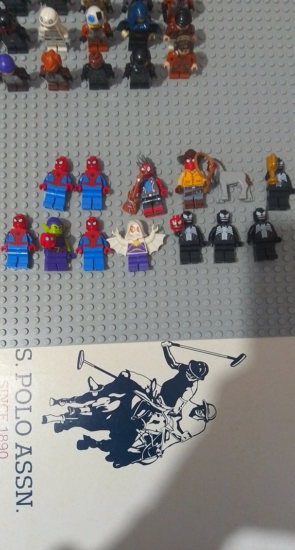 Çok sayıda Örümcek Adam, Venom ve diğer figürlerin bulunduğu gri Lego tabanlı set. Detaylı minifigürler ve dokulu yüzey içerir.