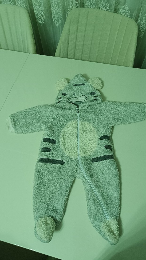 Yumuşak ve sıcak gri renkli leopar desenli bebek tulumu, kürk detaylı ve kulaklı kapüşonlu bir tasarıma sahiptir.