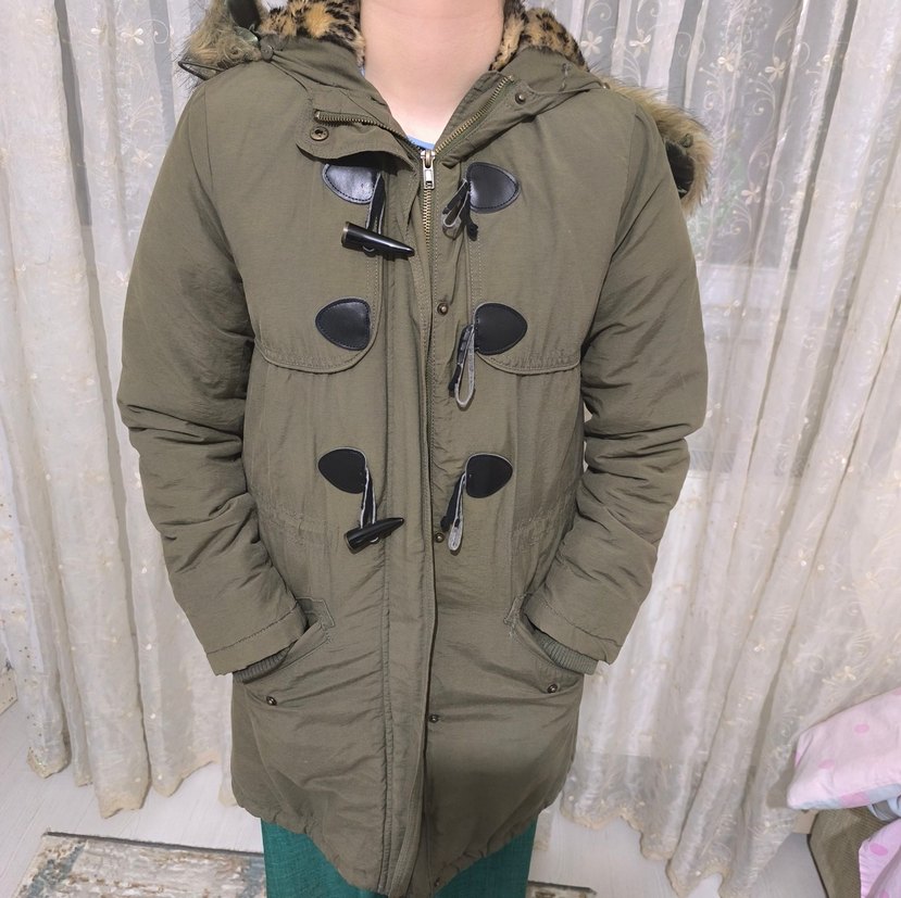 Gri tonlarda, leopar desenli astarlı ve kürklü detaylı uzun, bol kesim çocuk mont. Notch yaka ve askılı kollara sahip, dış mekan kullanımı için uygun. şapkasında hafif sökük var. kalın yumuşacık soğuk geçirmez.