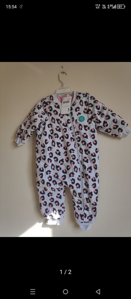 Leopar desenli, gri renkli fermuarlı bebek tulumu, kolay giydirme sağlar.