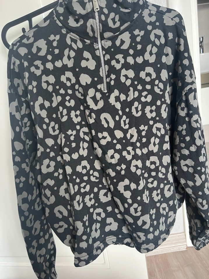 Yüksek yakalı, fermuarlı, uzun kollu ve bol kesim gri leopar desenli kadın sweatshirtü. Yumuşak sentetik kumaştan, rahat sokak stiline uygun.