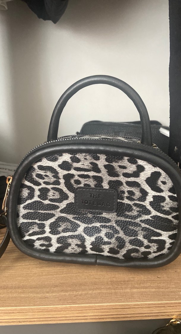 Gri leopar desenli ve kürklü detaylı kadın deri çanta. Günlük kullanım için bohem ve retro tarzı yansıtır.