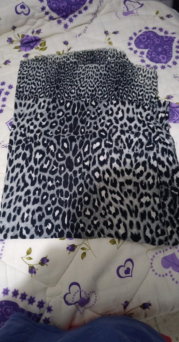 Gri renkte, leopar desenli ve fırfır detaylı kadın fular, yumuşak sentetik kumaştan üretilmiştir.