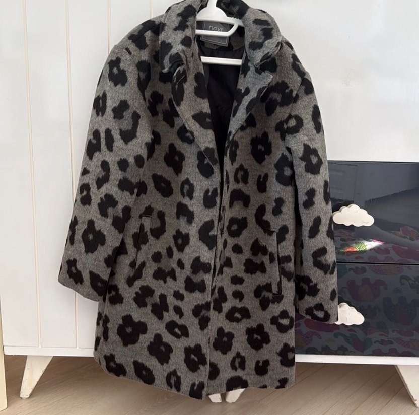Gri renkli, leopar desenli kaban, bol kesim ve uzun kolludur. Kürk detaylı, yumuşak ve sıcak kumaştan yapılmıştır, rahat günlük kullanım için uygundur.